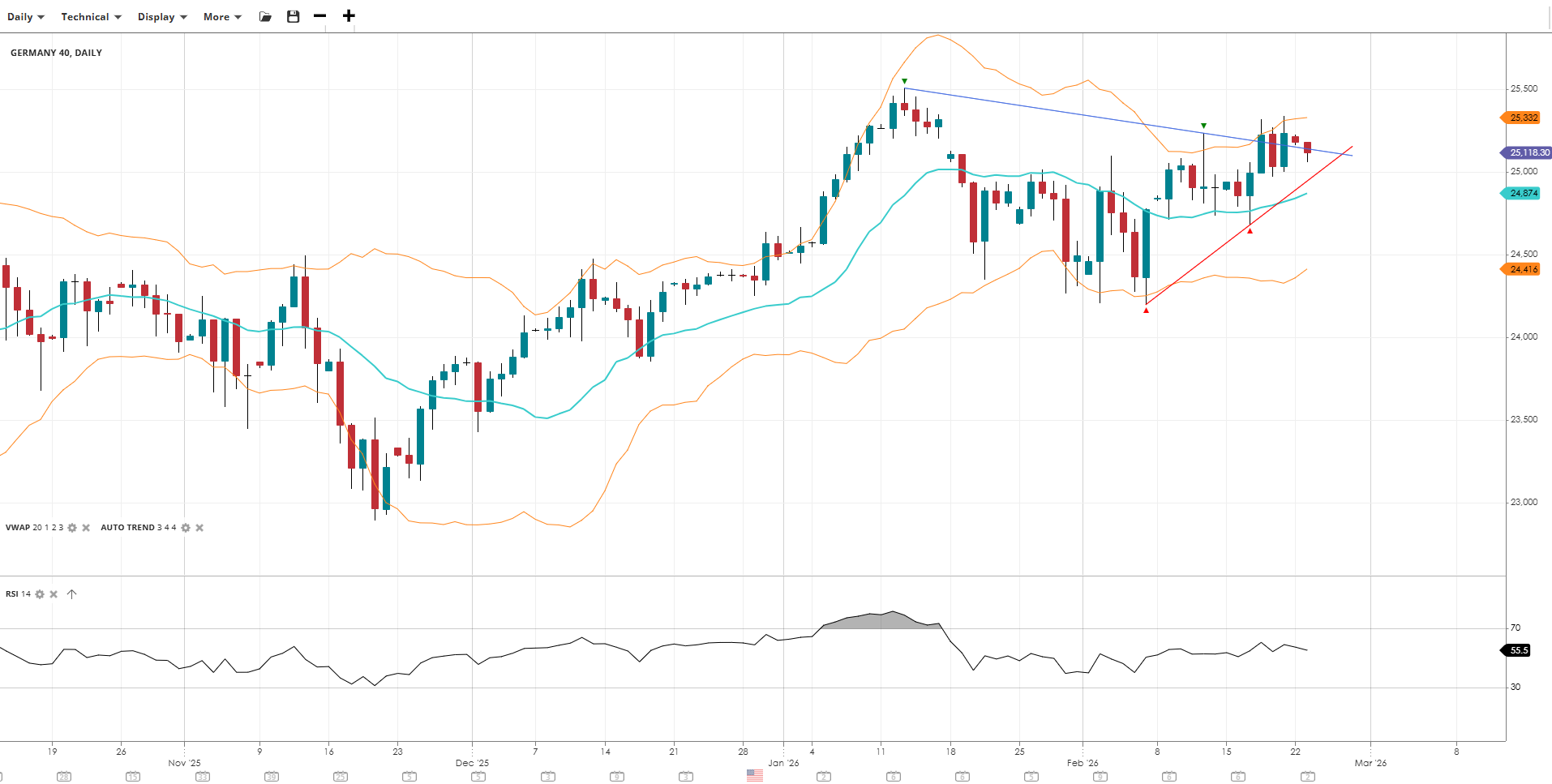 The Germany 40 has broken above the 25k psychological level and is trading at 25,118, now above its VWAP of 24,874. The RSI has ticked up to 56, reflecting improving momentum as the index targets the upper resistance band at 25,332. Support has risen to 24,416, with bulls looking to consolidate above the 25k level as a new base.