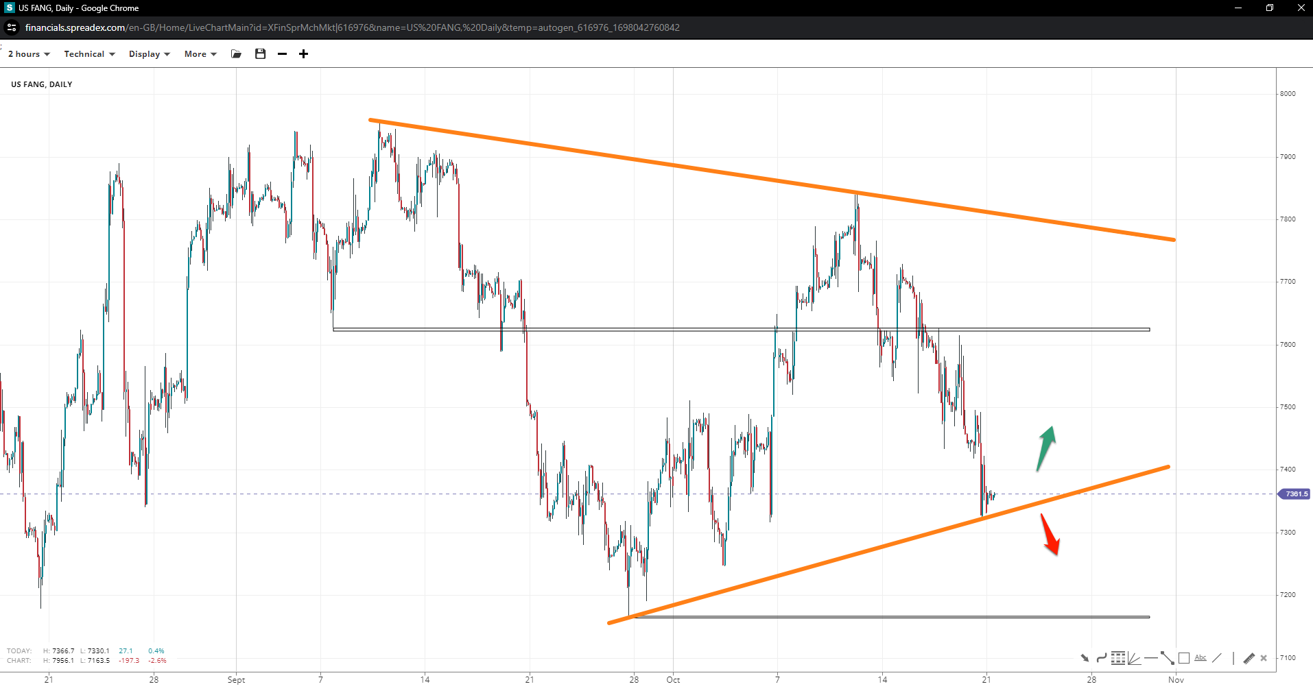 The FANG index could form a triangle while trading above the 7165 mark, preparing for an advance towards 7630 following a move past 7500. A slide under 7245 would increase bearish chances, with an eventual break of the swing support opening up the 7k handle.