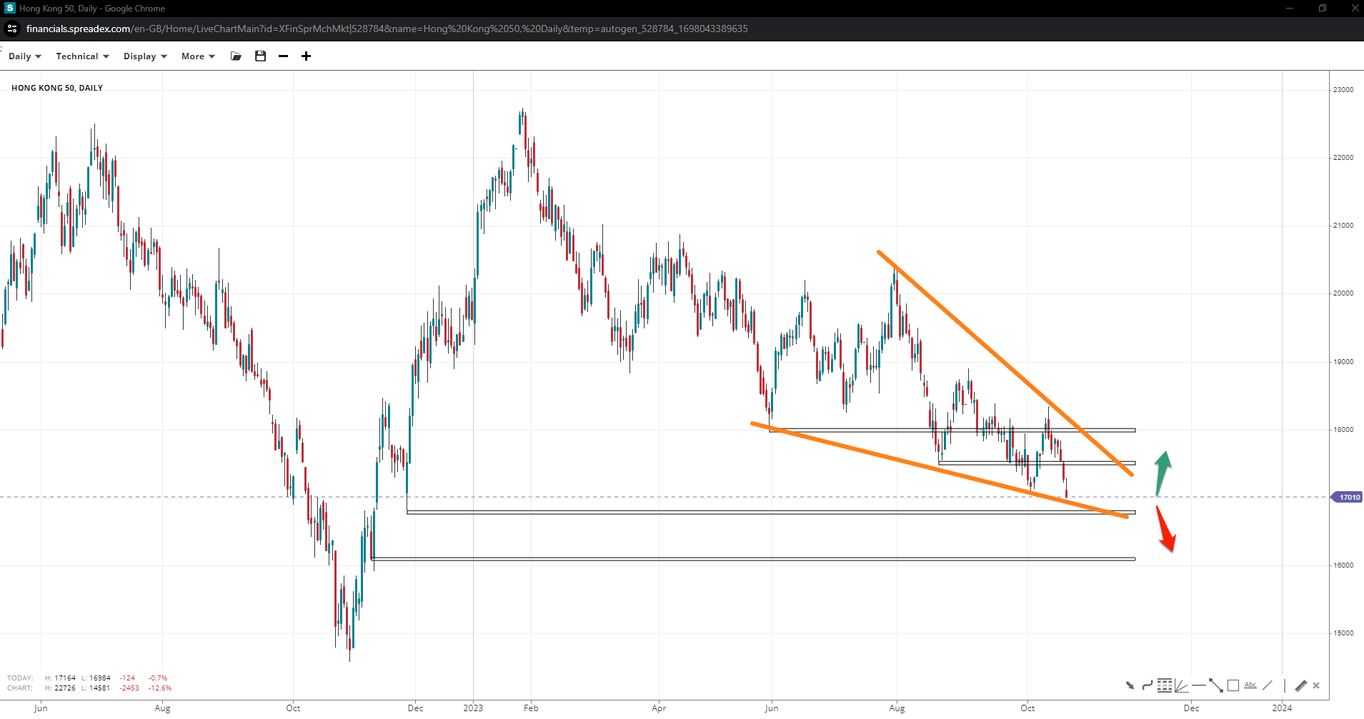 Bulls may face difficulty at 17k but are likely to receive support at 16750 as the index forms the last leg of a wedge pattern. If there are additional shorts, 16k will come into the spotlight. Conversely, 17500 may pave the way to 18k, where the chances of a complete wedge will rise.