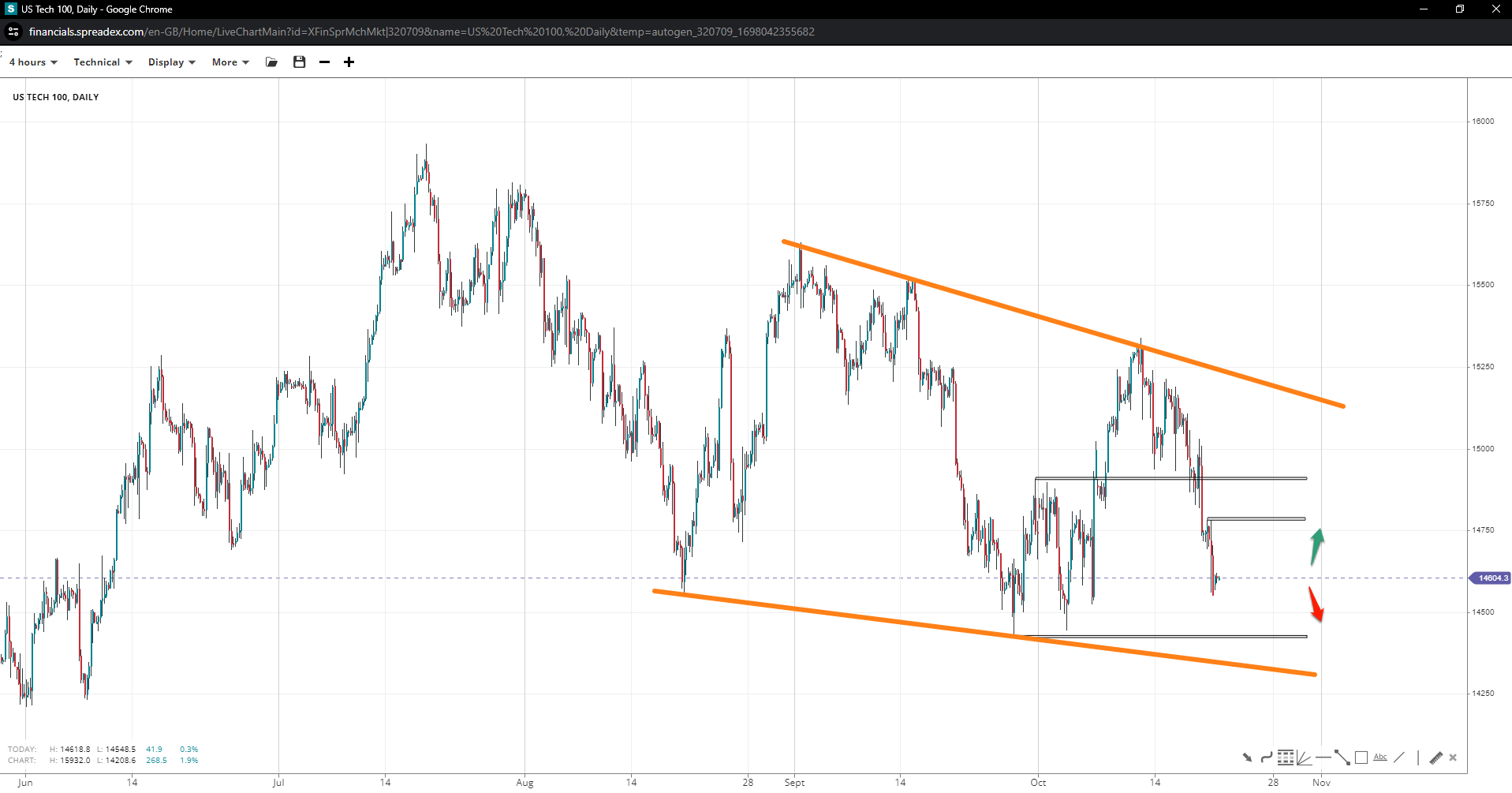 The US Tech index exhibits an overall negative PA near the bottom of 14430, exposing 14250 as part of a wedge pattern. 14900 is seen as a regional high above 14780.