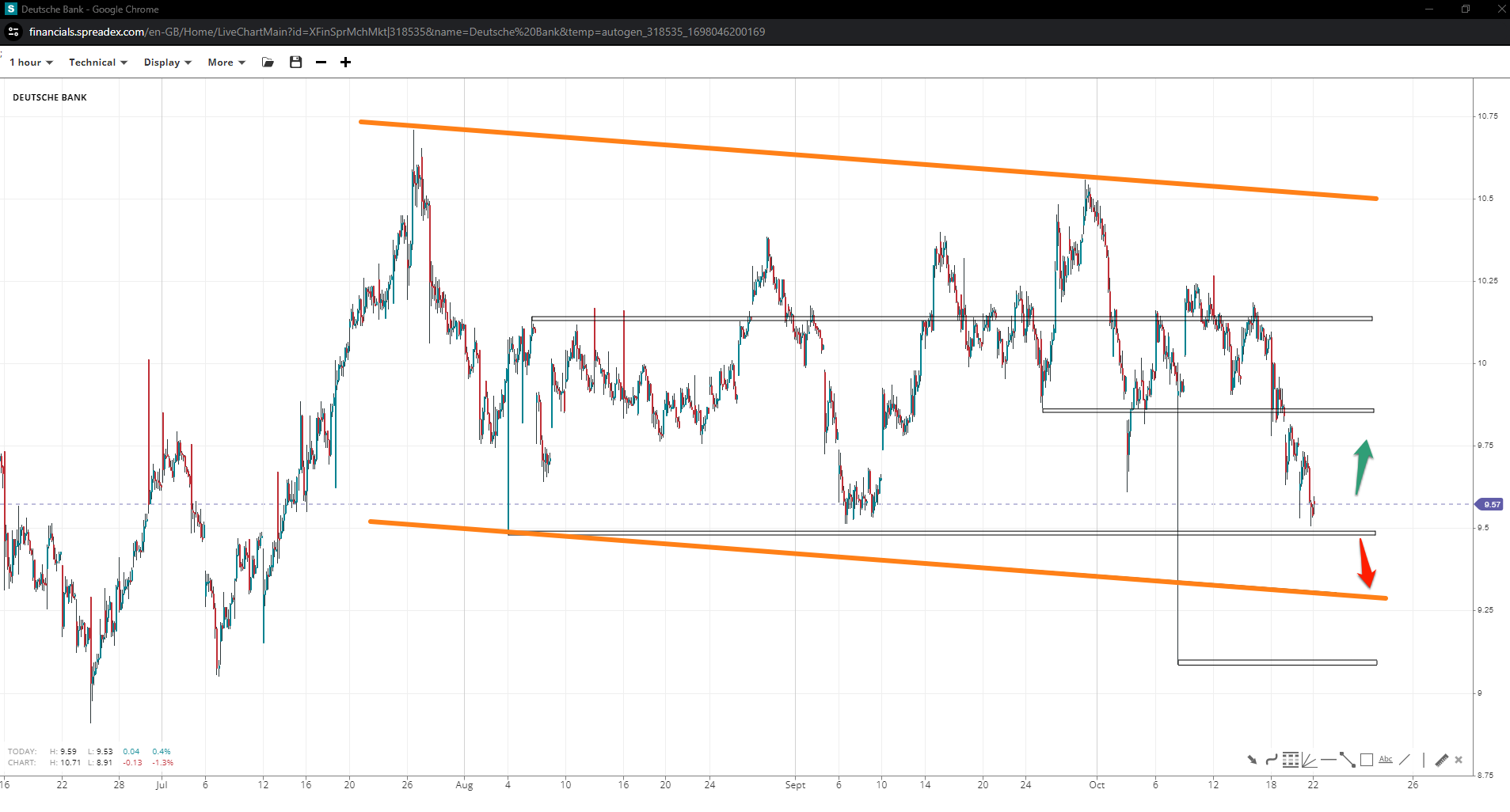 Deutsche could head down to  €9 if the trend continues within the descending channel and under €9.85 unless the bottom trendline holds bears off. If the local resistance is won over, the low might be in, possibly triggering a move toward double digits again.