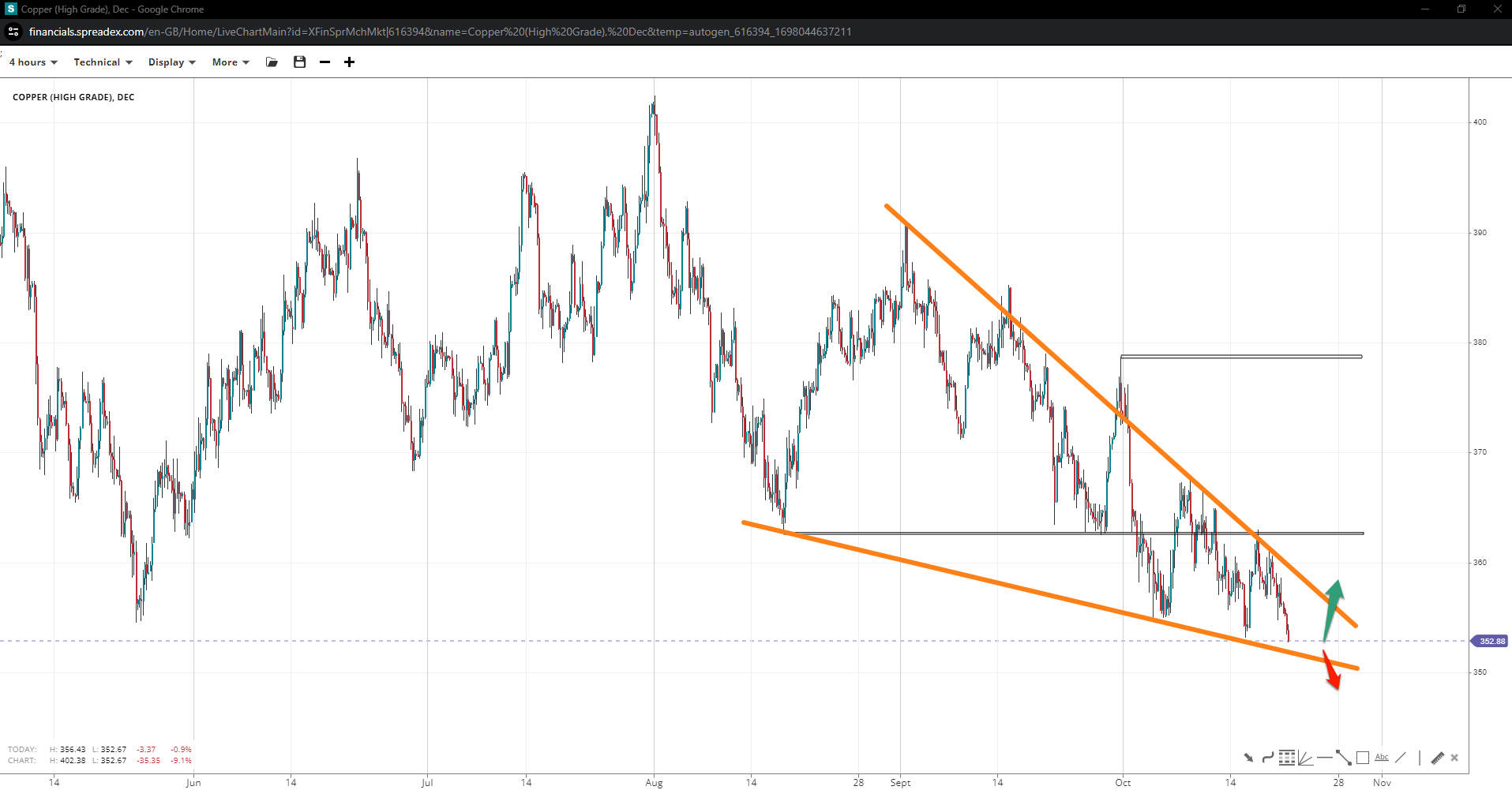 Copper formed a double bottom at $353 but may complete a wedge pattern close to $350 before reversing. Bulls must take $362 over first, with $378 as a critical hurdle for the reversal. An extension under the lower wedge trendline may induce downward pressure, potentially clearing the path to $340.