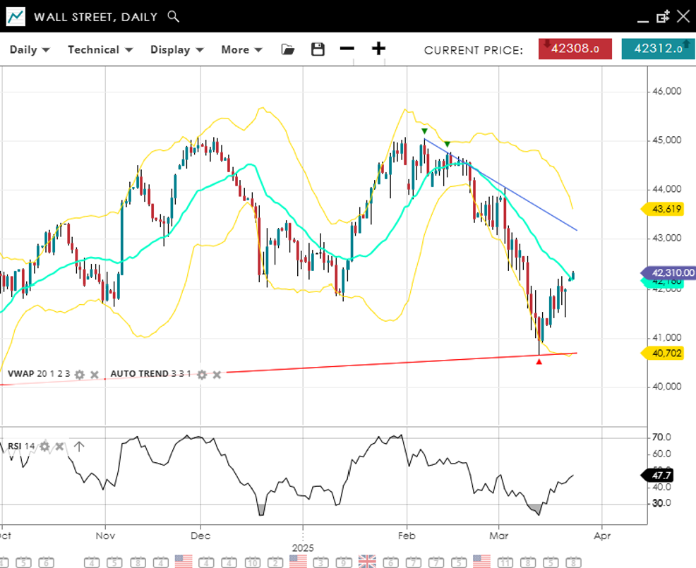 Wall Street upholds its bearish momentum but a rally of the lows puts it into a correction, currently at 42,310, hovering around the 20‐day VWAP of 42,180. With an RSI of 48, the index isn’t oversold but still faces downside pressure. Key support appears near 40,700, and any rebound may encounter resistance around 43,619.