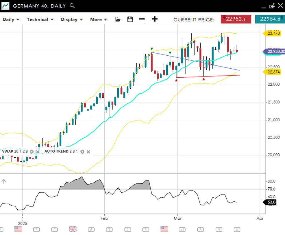 Germany 40 retains its bullish trend and impulsive stance, trading near 22,954 just above the 20‐day VWAP of 22,900. An RSI of 54 suggests neutral momentum, which continues to show bearish divergence. If the index slips, 22,375 could serve as near‐term support, while a decisive break above 23,473 may open further upside.