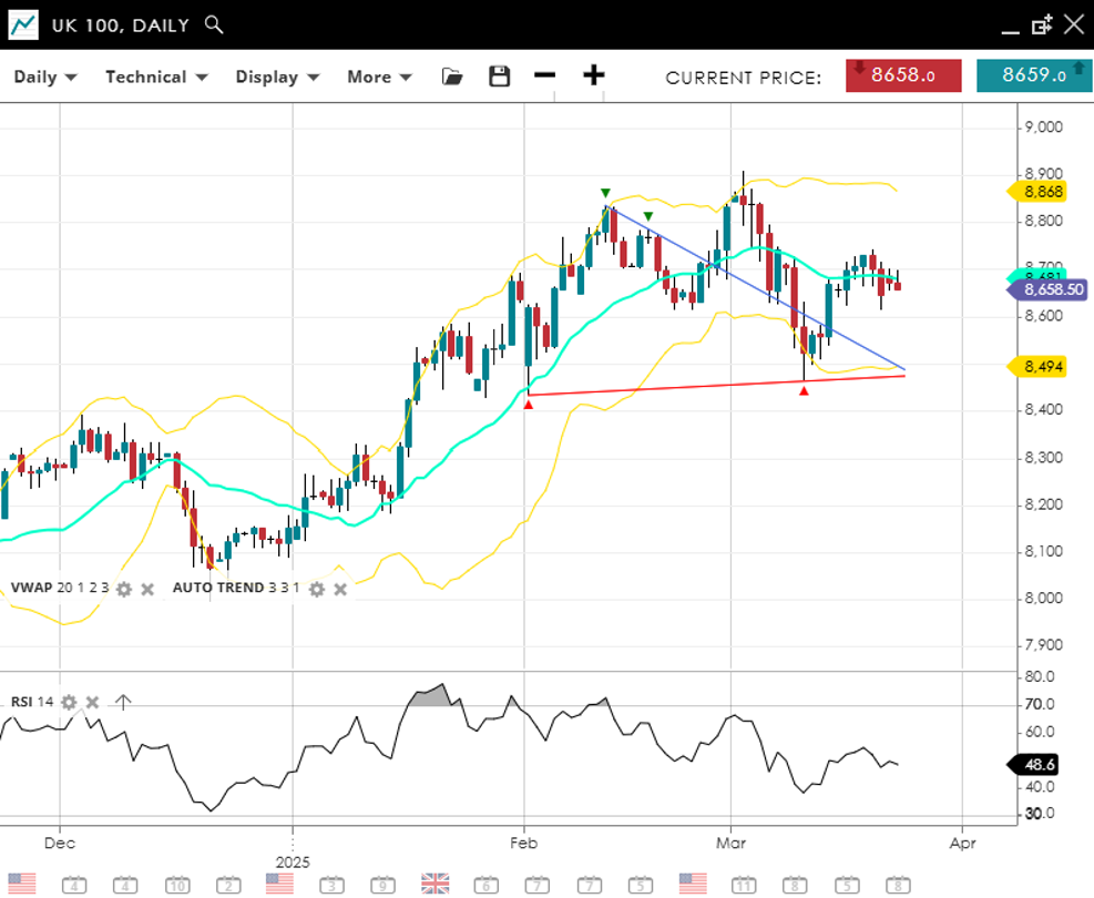 UK 100 has flipped into a neutral/sideways trend, consolidating after the Jan-Feb rally, quoted at 8,659 just below the 20‐day VWAP of 8,681. The RSI at 49 indicates muted momentum. 8,494 marks notable support if selling accelerates; on the upside, a move beyond 8,868 could signal renewed strength.