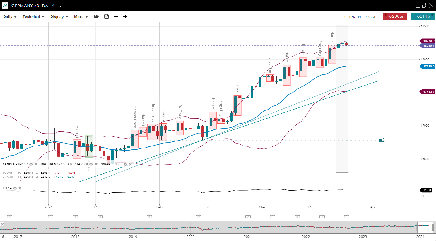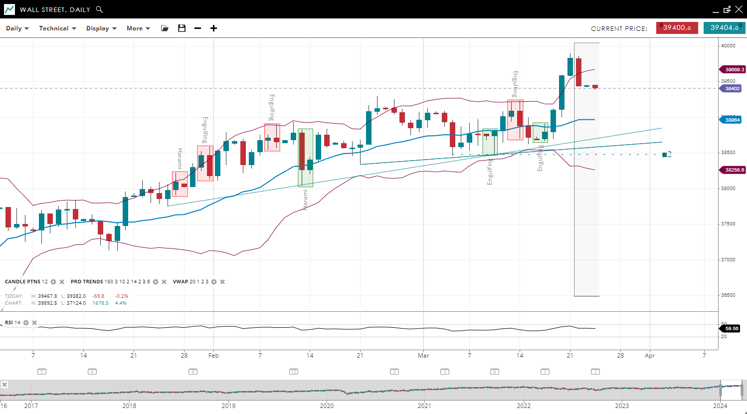 Wall Street remains in a bullish trend in the impulsive phases but put in a large bearish engulfing candle, with the price adjusting to 39,402, still above the upward-sloping 20-period VWAP of 38,964. The index's support is at 38,258, with resistance determined at 39,669. The RSI is at 59, reflecting a shift towards a more bullish momentum state from neutral.