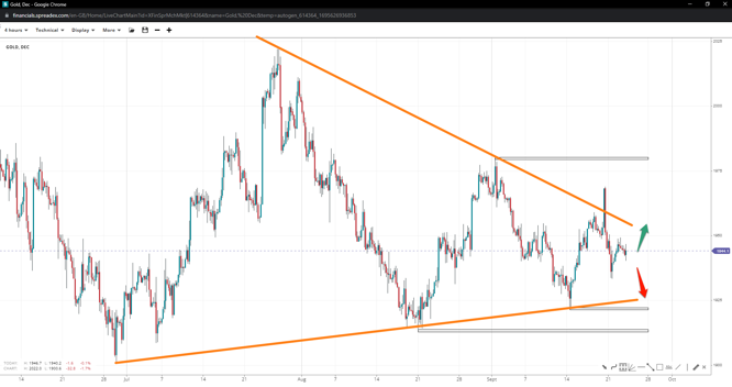 Easing upward momentum formed a fakeout past the upper triangle trendline in gold, bringing the focus back to the $1920 low per ounce. Losing it will increase speculation for $1913 without changes on the formation, but only a break past 1980 will eventually confirm it.