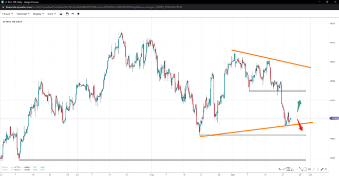 An attempt at breaking 14550 failed on the Nasdaq, with an immediate bounce higher likely to form a triangle unless demand wanes ahead of 15130, leading to a complete bearish flag instead. Breaking under the swing low will expose 14250.