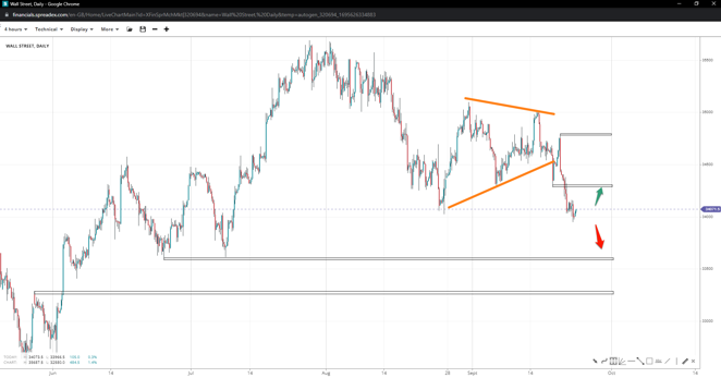 Dropping under 34060 has increased the chances of a falling pennant, with further declines opening up 33610 but unlikely 33290. If bulls can reclaim 34300, an attempt at 34780 may be seen.