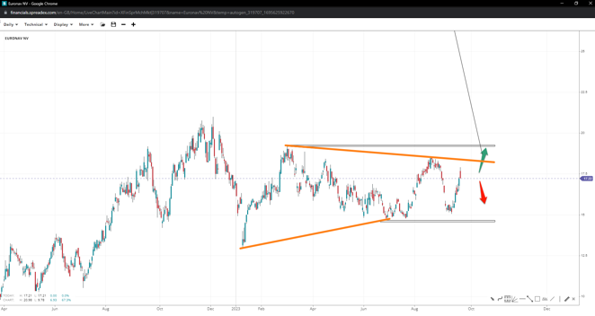Euronav’s stock price shows a complete triangle pattern that ended at EUR 15 unless bullish attempts past 18.50 fail, reducing the probability for a breakout towards the measured-move projection high of EUR 26 should 19.20 gives way. Sliding under the EUR 14.50 support may provoke additional shorts towards EUR 13.