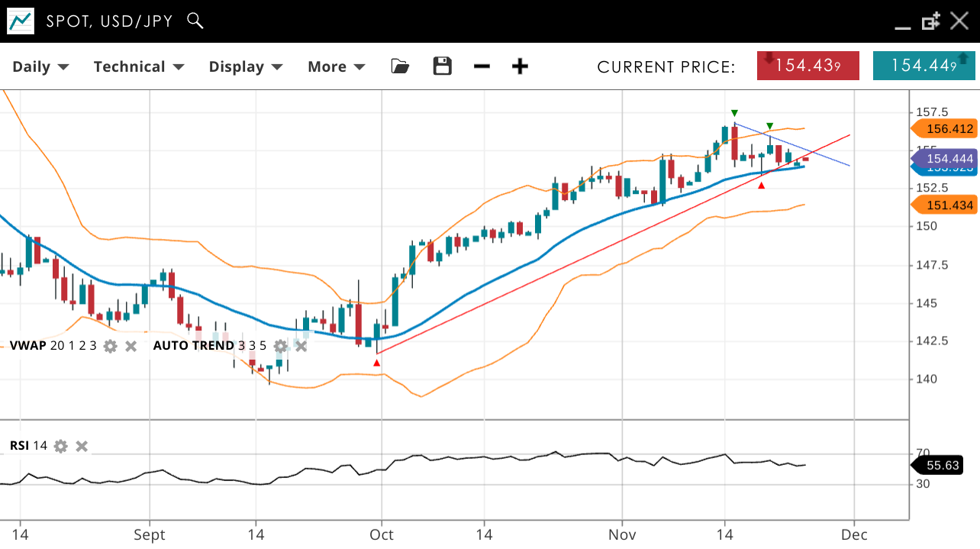 USD/JPY remains bullish in a correction phase, trading at 154.44, slightly above the VWAP (20) of 153.20 but below former highs. Support is at 151.43, with resistance at 156.41. The RSI at 55 reflects continued bullish momentum, with room to advance further before approaching overbought levels.