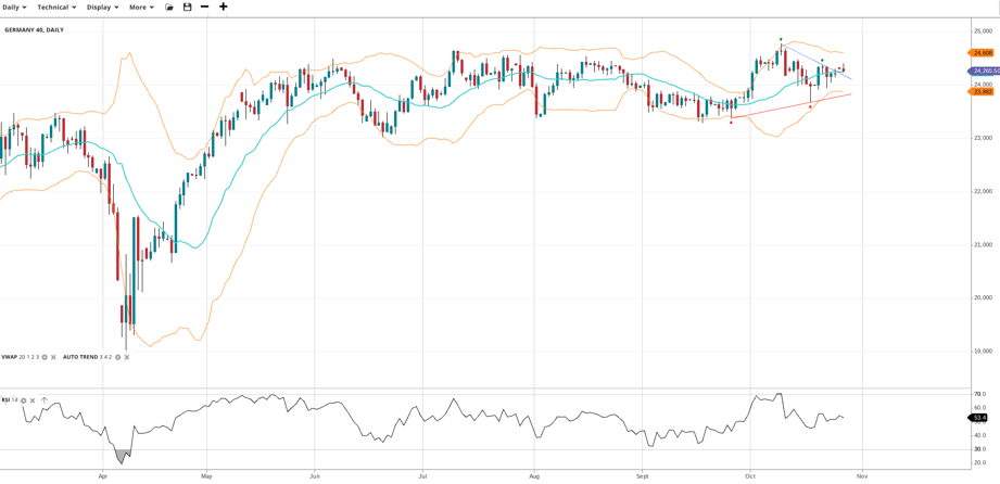 Germany 40 remains rangebound, trading at 24,266, slightly above its VWAP of 24,200. The RSI at 53.4 shows stable momentum. Support is at 23,882, while resistance stands at 24,608.