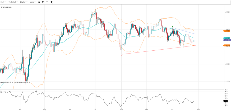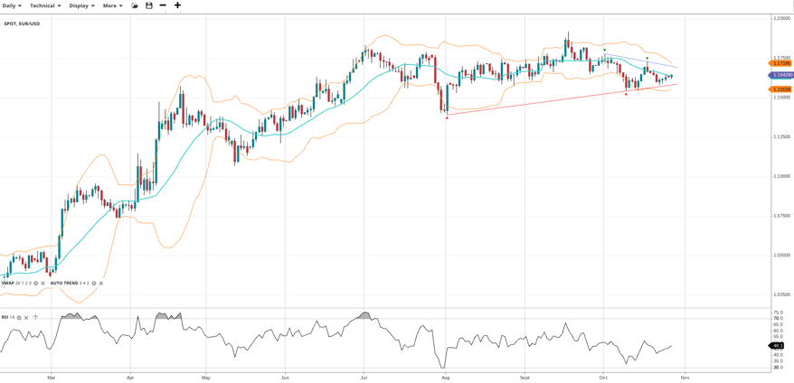 EUR/USD is still stuck in its trading range. It trades at 1.1643, right around the VWAP. The RSI at 48.1 shows a lack of strong conviction in either direction. Support is at 1.1554 and resistance is also at the VWAP level of 1.1719.