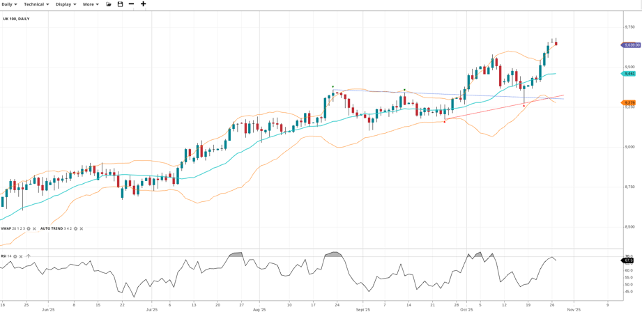 The UK 100 has hit a new record high, in a new impulsive phase of its bull trend. It trades at 9,639, clearly above the VWAP at 9,461, suggesting strong upward momentum. RSI is elevated at 67.5, indicating strong bullish sentiment. Support is at 9,279, with resistance matching the recent high.