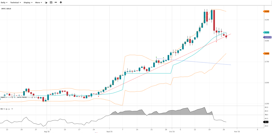 Gold has shifted into a correction phase following its long bullish trend, trading at 4,044 just under the VWAP of 4,101. The RSI of 51.1 reflects neutral momentum. Support is a good amount lower at 3,850, with resistance back at the highs at 4,352.