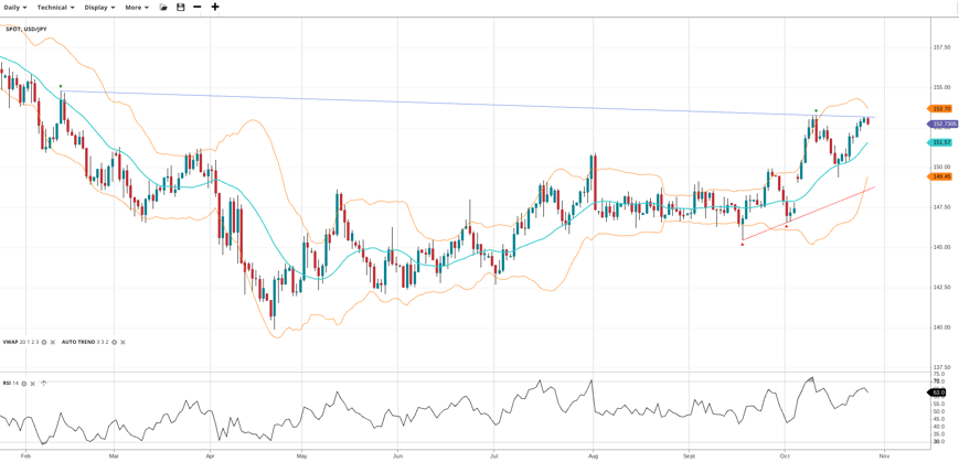 USD/JPY sustains its bullish trend with a retest of the prior multi-month high, trading at 152.73, above the VWAP of 151.57. The RSI of 63.0 reinforces the strong upward momentum. Support lies at 149.45, while resistance is at 153.70.