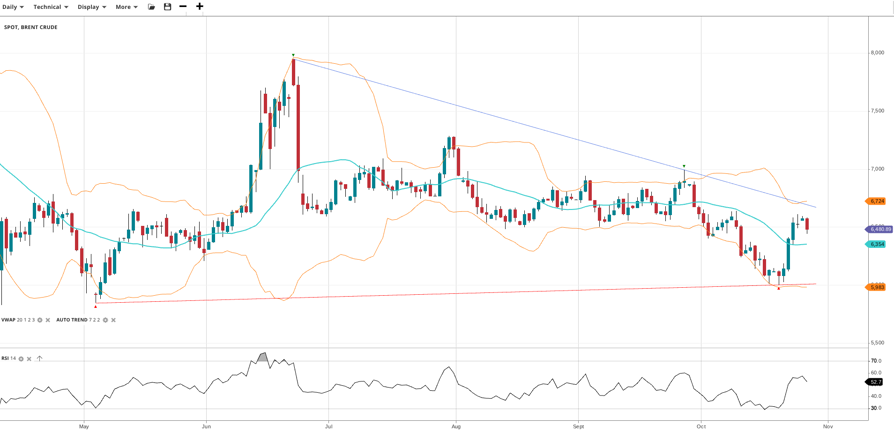 Brent Crude is in a bearish trend but a 2-day surge has taken it into a correction. Trading at 6,481, it sits above the VWAP at 6,354, hinting at potential recovery. The RSI at 52.7 supports a balanced market outlook. Support is seen at 5,983, while resistance stands at 6,724.