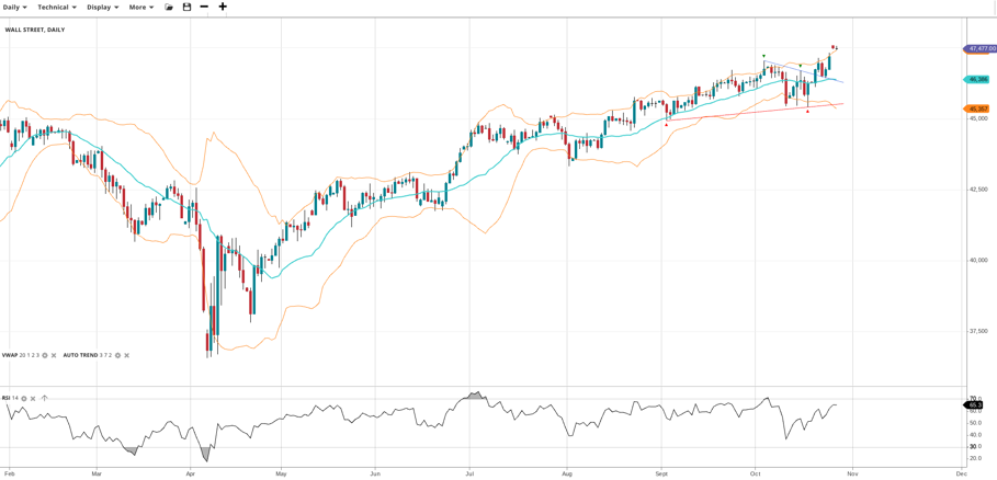 Wall Street continues its bullish trend and has resumed an impulsive phase, trading at 47,477 above the VWAP of 46,386. The RSI at 65.3 confirms good upward momentum. Support lies at 45,357, with resistance forming at the new high of 47,477.