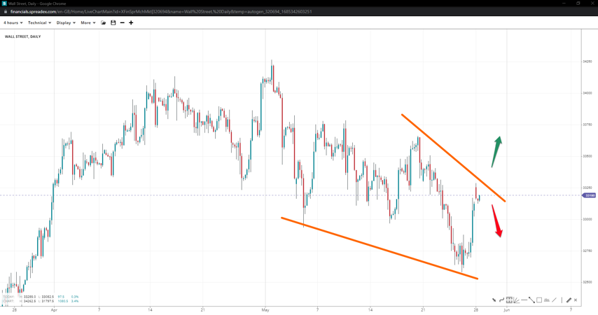 Wall Street could not break past 33300, but bulls managed to hold above the 33k handle in what appears to be a potential breakout towards 33750. If 33k is breached, a move toward the lower end of the range at 32500 will be more likely, but we might witness the formation of a falling wedge in doing so.