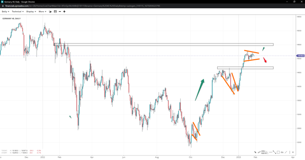 The German 40 index trades in a narrowing range that resembles a triangle pattern. However, either a flag or pennant could print. 15k appears as short-term support, with its break sending prices to 14680 unless bulls recapture the 15270 peak. Above the former, the index remains biased up, with the next target at 15500.