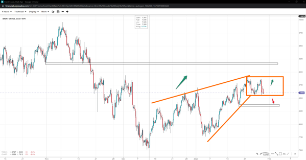 The sideways correction in brent resembles a short-term rectangle top pattern with a breakout in either direction possible. Given the wedge pattern printed and the uptrend off the 75.00 lows, breaching the upper band at 89.00 could open the door to 91.70. A swing low of importance can be seen at 83.50, with the 80 round support below.