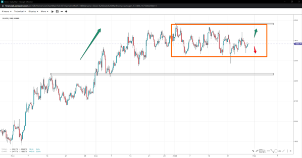 Silver continues to consolidate with a flag, pennant, triangle or rectangle pattern all at play. Of note is that prices are range bound, with a breakout imminent in either direction. The upper limit lies at 2480 and the lower at 2230, while anything between is expected to extend the sideways price action.