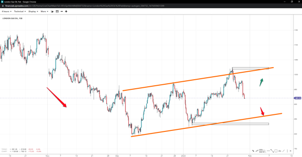 The price of London Gas reached a high of 1025 before reversing bearishly, leaving a flag pattern imprint and aiming for the lower channel below 900. Losing the bottom trendline could see a leg down at the 800 base unless 830 offers some respite. An upward attempt could see triple digits revisited.