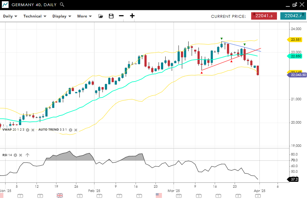 Germany 40 has shifted into a corrective phase within what is still just a bullish trend overall, currently trading around 22,042, below its 20-day VWAP of 22,850. The RSI at 37.2 reflects weakening momentum, aligning with the recent downside break. Immediate support lies at 22,043. A reversal above resistance at 23,551 would be needed to revive bullish sentiment.