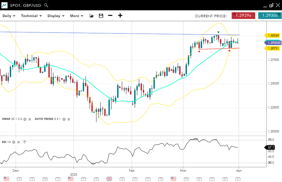 GBP/USD is still bullish as it sits in a tight correction, priced at 1.29306, holding above its 20-day VWAP of 1.29302. The RSI at 57.1 supports the ongoing trend but shows moderation from previous highs. A break below 1.28721 may trigger caution, while further upside needs a break of 1.30069.