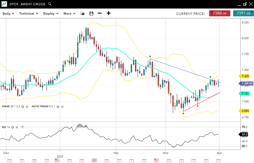 Brent Crude holds a bearish trajectory but the corrective move is gathering steam, trading at 7,289, above the 20-day VWAP of 7,131. The RSI at 55.2 is neutral, offering little directional clarity. Immediate support sits at 6,856, while 7,405 will test further upside.