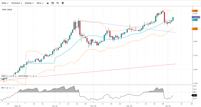 Gold is in a bullish trend but currently pulling back. It is trading at 4,435, slightly above the VWAP of 4,388. RSI at 60.3 suggests bullish undercurrents. Support is at 4,226 and resistance stands at 4,550.