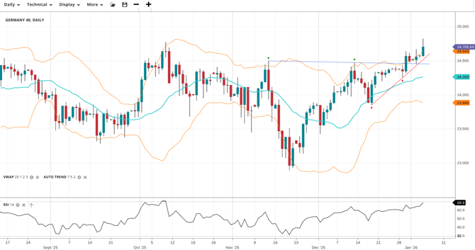 Germany 40 is in a bullish trend and has just confirmed a breakout, trading at 24,706, significantly above the VWAP of 24,265. The RSI at 68.9 reflects strong bullish momentum. Support is now seen at 23,886, with the breakout level at 24,643 acting as a new reference.