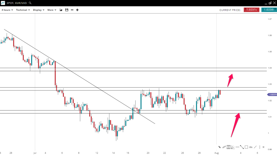 EUR/USD successfully broke the bearish trend line to  the upside after finding buyers near the 0.99 mark. The price has since entered into a consolidation period where a breakout to the upside could be seen before a move upwards to test 1.04. A less likely scenario is for the EUR/USD to  reverse lower again from the consolidation to test the previous support near 0.99.