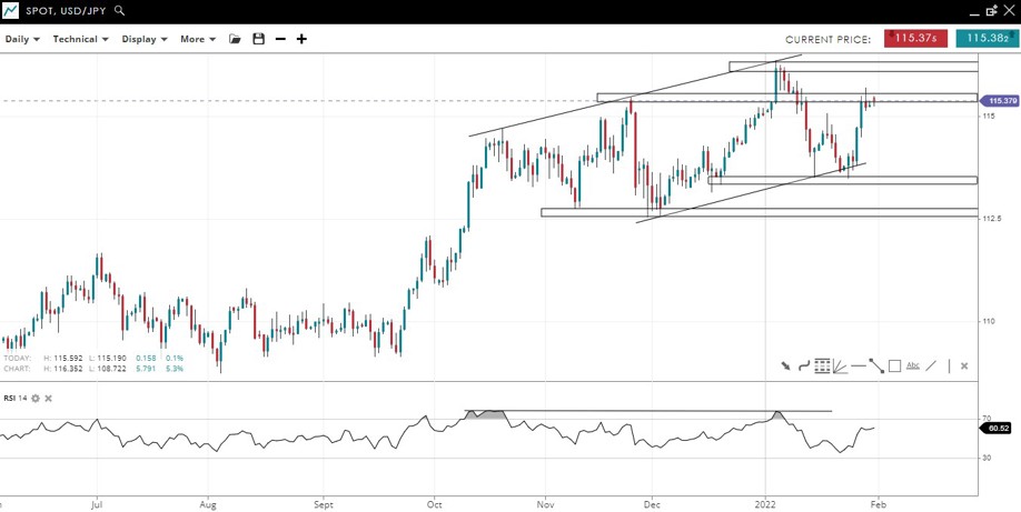 The price has jumped after a second successful test of 113.50 support and is now back up challenging the 7-year high formed a fortnight ago.