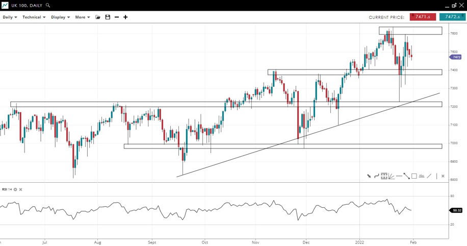 The UK 100 rebounded strongly off a rising trendline and 7230 support to retest the 2022 peak before pulling back. The price is in a volatile uptrend.