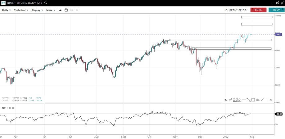 The price is consolidating under 90.0 after a brief touch of 85. The upwards momentum suggests a break higher towards 94 then 100.