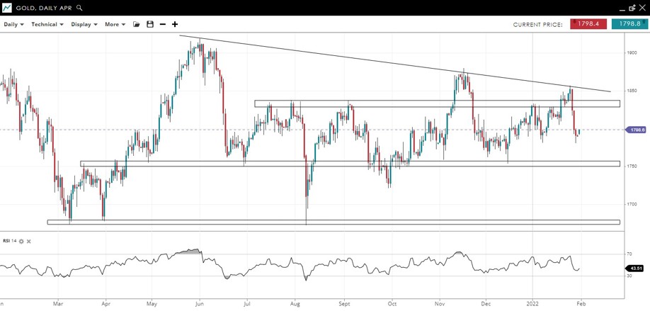 The price fell back from a declining trendline at 1850, failing to break above the prior peak at 1880 and posted a bearing weekly engulfing candle pattern.
