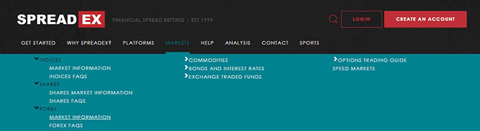 If you don't have a Spreadex account, go to our Range of Markets page, then select Market Information for the sector you require (e.g. Indices, Shares, Forex, Commodities etc.).