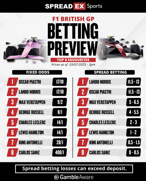 Read on below for Spreadex Sports' 2025 Formula 1 British Grand Prix betting preview with the latest odds and spread betting prices ahead of the massive race at Silverstone, a key fixture in the British sporting summer. With a British driver winning in three of the last five years, will that trend continue?