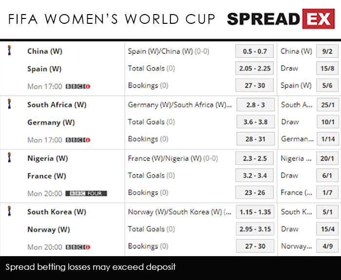 China – who were actually the inaugural hosts of the tournament back in 1991, and were runners-up in 1999 – are also on 3 points, as a 1-0 victory over South Africa came compensated for a 1-0 defeat against Germany. Though a draw would see China progress, it would be via 3rd place, creating a potential tricky fixture against the winners of either Group C or D (likely Italy or England). La Roja are fancied to come out on top, with Spreadex offering a Spain/China Goal Supremacy spread of 0.55-0.75, alongside a Total Goals spread of 2.05-2.25. South Africa vs Germany, 5pm on BBCiLeading Group B thanks to some typical German efficiency, all Die Nationalelf have to do is avoid defeat against the points-less South Africa if they are to maintain 1st place. More important, then, will be that Germany put in the kind of performance that goes beyond grinding out a 1-0 win. Luckily it looks like they’ll do just that, with Spreadex offering a Germany/South Africa Goal Supremacy spread of 2.8-3, with a Total Goals spread of 3.6-3.8. Nigeria vs France, 8pm on BBC FourAs for Group A, France will have the top spot pinned down if they can take at least a point off Nigeria. A confident tournament-opener against South Korea, one that saw the hosts put 4 past South Korea, was followed by a 2-1 win against Norway where France scored all 3 goals (Wendie Renard bundled it into her own net early in the 2nd half). Nigeria, meanwhile, suffered a 3-0 slump against Norway in their first fixture, before getting themselves back into the group with a 2-0 win against South Korea. A draw would be enough for the Super Falcons; even a loss could see they reach the next round. They may have to settle for that latter outcome, with Spreadex having a France/Nigeria Goal Supremacy spread of 2.3-2.5. South Korea vs Norway, 8pm on BBCiLike Nigeria, a single point would put Norway into the last-16, a feat that isn’t hard to picture given they are taking on South Korea. Not only are the South Koreans yet to pick up a point, they are yet to score a goal, while conceding 6 in just 2 games. The Grasshoppers should be able to leap into the knockouts, then, at a Norway/South Korea Goal Supremacy spread of 1.15-1.35, alongside a Total Goals spread of 2.95-3.15.