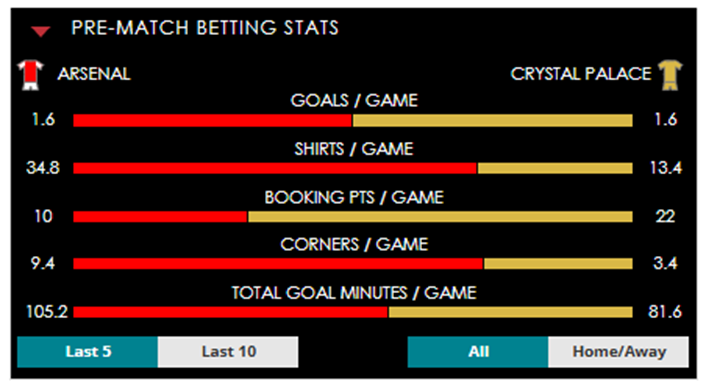 To see all the Arsenal v Crystal Palace betting stats and form, visit our pricing page to view our Pre-Match betting stats table or hover over/tap the chart image to see previous outcomes for that particular market.