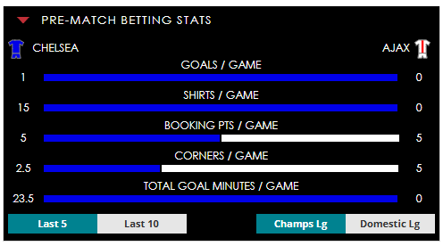 To see all the Chelsea v Ajax betting stats and form, visit our pricing page to view our Pre-Match betting stats table or hover over/tap the chart image to see previous outcomes for that particular market.