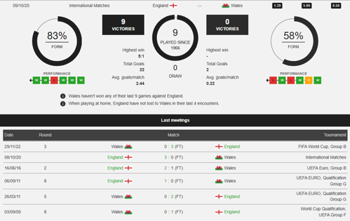 To see all the England v Wales betting stats and form, visit our pricing page to view our Pre-Match betting stats table or hover over/tap the chart image to see previous outcomes for that particular market.