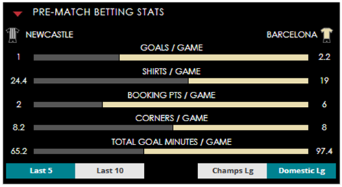 To see all the Newcastle v Barcelona betting stats and form, visit our pricing page to view our Pre-Match betting stats table or hover over/tap the chart image to see previous outcomes for that particular market.