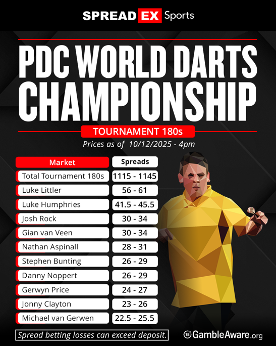 In terms of spread betting, Spreadex are offering a range of markets aside from standard Outright Winner markets, including Name the Finalists, Top Continental Europe, Checkout Specials, Top English W/O Littler & Humphries, and more!